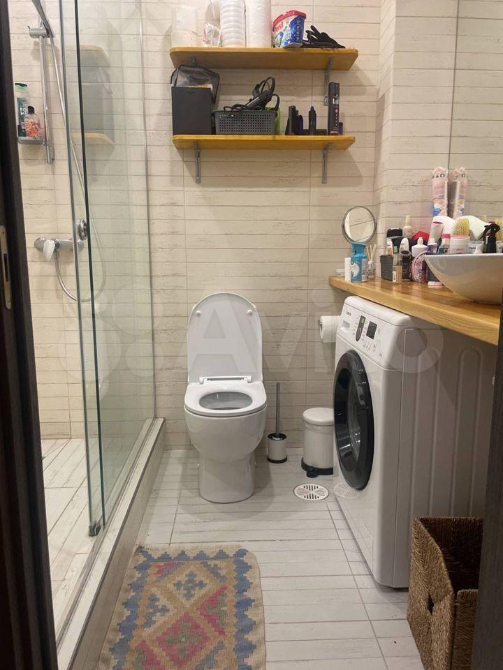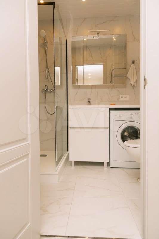 Совмещённый санузел: душевая зона, раковина, шкафчик,стиральная машина, бойлер,гигиенической душ. Панорамное остекление балкона, вид на старый город, во двор.