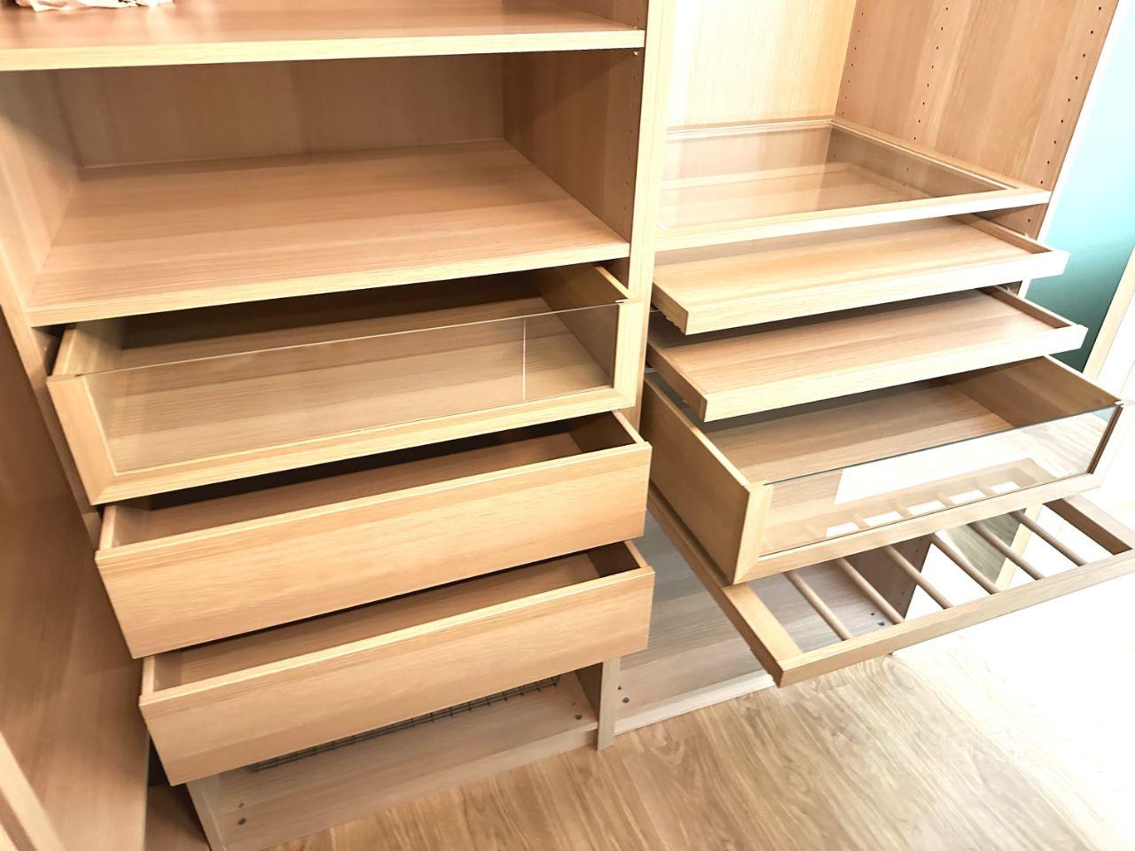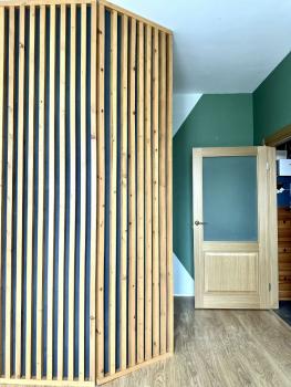 Плюс в спальне большая гардеробная , с выдвижными ящиками , брючницами и зоной для ремней и украшений. Декоративная реечная стена.