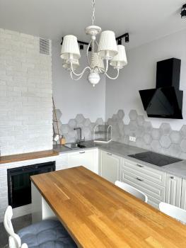 Кухня: Вся техника (индукционная варочная панель, духовой шкаф и свч в колонне, посудомоечная машина 60см, вместительный холодильник, вытяжка). Все шкафы с плавными доводчиками и выдвижные, есть защита для детей.