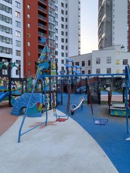 Во дворе большие и разнообразные детские площадки, зеленые зоны.