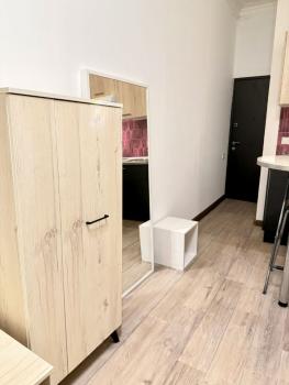 Из мебели - кухня с варочной поверхностью, барная стойка, раскладной диван, комод, шкаф, большое зеркало и новый холодильник.