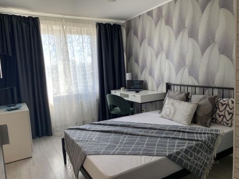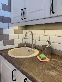 В комнате качественный диван, подходящий для комфортного ежедневного сна, который в разложенном состоянии дает спальное место размером 160*200. Телевизор 43, кухня на хороших комплектующих с доводчиками, чайник, микроволновка, стиральная машина, холодильник.