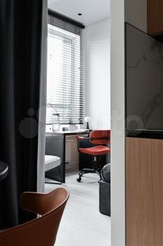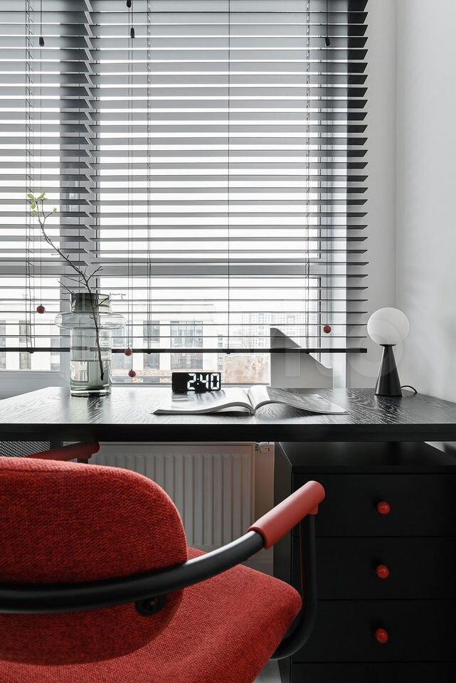 - полноценный рабочий стол, выполненный из шпона дуба, который размещен перед окном, откуда открывается вид на город. Места хранения для документов, удобный рабочий стул с возможностью регулировки, а также кресло для чтения, отдельное освещение рабочей зоны.
