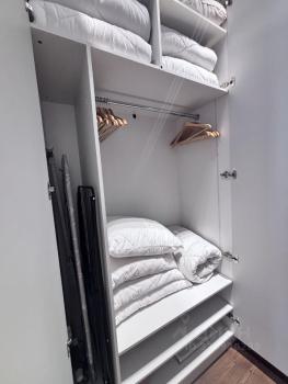 В спальне кровать 160/200 с ортопедическим матрасом. В кухне-гостинной раздвижной двухспальных диван. Все шкафы эргономичны с мах вместимостью.