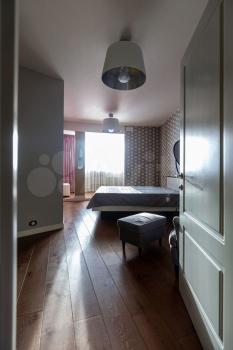 Между спальней и кухней-гостинглй установлена межкомнатная раздвижная лофт-перегородка. Жто позволяет как оставлять диван в лофт-зоне гостиной, и закрывать спальню, так и сдвигать его в зону спальни к поднятой кровати и оставлять перегородку открытой – что оставит ощущение большого пространства и будет комфортно для приема гостей.