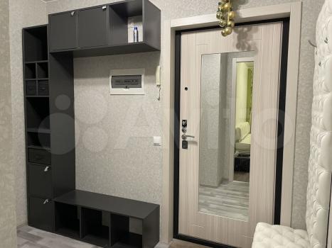 Студия полностью мебелирована: встроенные шкафы, комод, место для работы, две кровати, обеденная зона, сейф, зеркало, вешалки, утюг, сушилка, гладильная доска, центральный кондиционер, электронный замок, стиральная машина, фен.