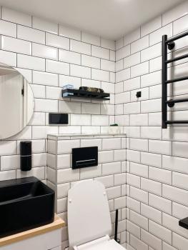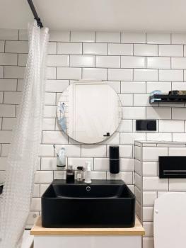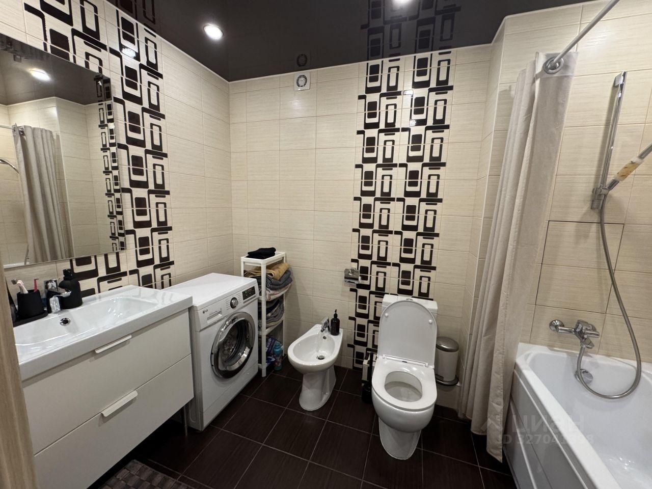 В ванной стиральная машинка с функцией сушки (2 в 1), электрический полотенцесушитель, шкаф-пенал и тумба под ракоаиной.