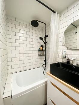 Санузел - из прихожей вход в совмещенный санузел площадью 4.38 кв.м. с ванной и душевой стойкой, над раковиной зеркало, унитаз, узкая стиральная машина, полотенцесушитель.