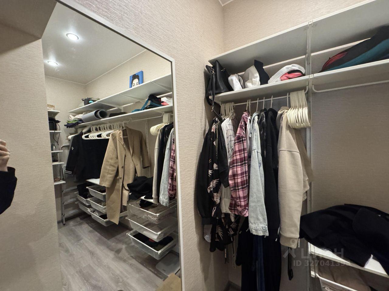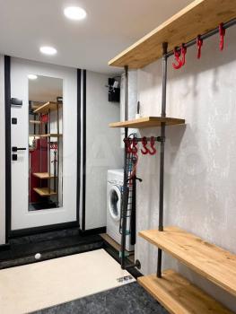 Гардеробная - из прихожей вход в мебелированную гардеробную площадью 3.16 кв.м., есть зеркало и деревянный табурет-стремянка.