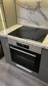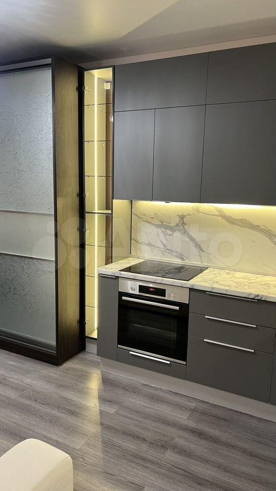 Студия зрительно разделена на две зоны - жилая и кухонный уголок - барной стойкой с двумя барными креслами. Встроенная кухня оснащена всей необходимой техникой: холодильник, посудомоечная машина, вытяжка, микроволновка, керамическая варочная панель, светодиодная подсветка на всю рабочую поверхность.