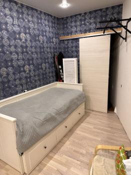 Еще одна комната оборудована вторым ярусом и спальным местом с матрасом ИКЕЯ 160*200, шкафом купе, письменным столом и дополнительной мебелью для хранения вещей и предметов интерьера