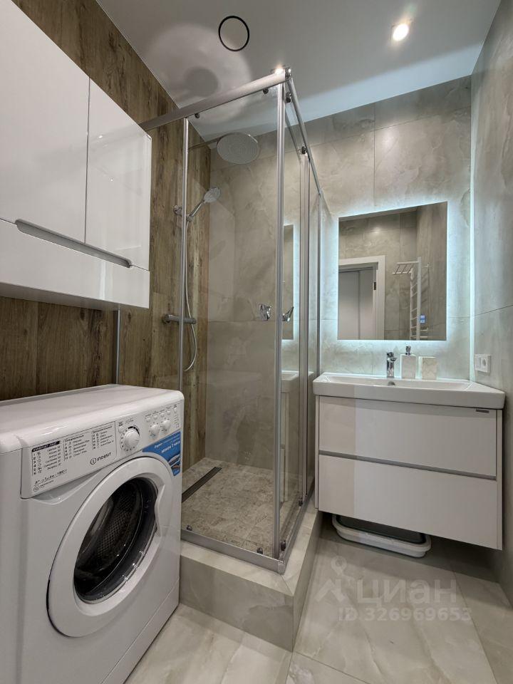 Санузел раздельный, оформлен стильной плиткой. В ванной комнате есть душевая кабина , стиральная машина, и шкаф.