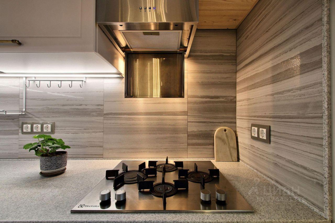На кухне: телевизор, духовой шкаф, микроволновая печь, вытяжка, варочная поверхность, посудомоечная машина, холодильник, раскладывающийся диван.