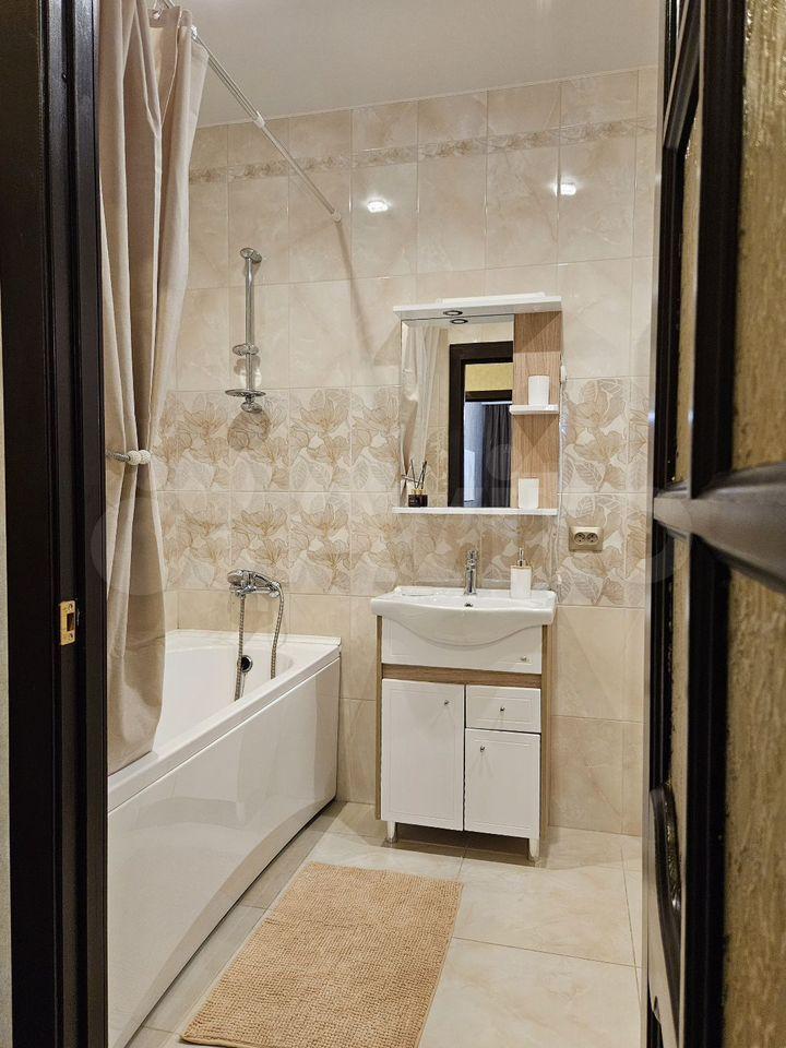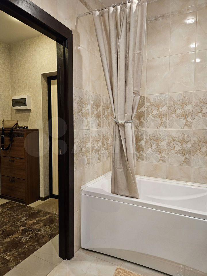 шторой, функциональную кухню-гостиную и большую ванную комнату с