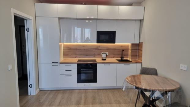 Квартира состоит из прихожей зоны с большим шкафом с зеркальными створками; просторной кухни-гостиной, укомплектованной кухонным гарнитуром, холодильником с небольшой морозильной камерой , встроенной техникой(варочная поверхность индукционная, ПММ), стиральной машиной, большой телевизор SmаrtТV. Есть фильтр питьевой воды.