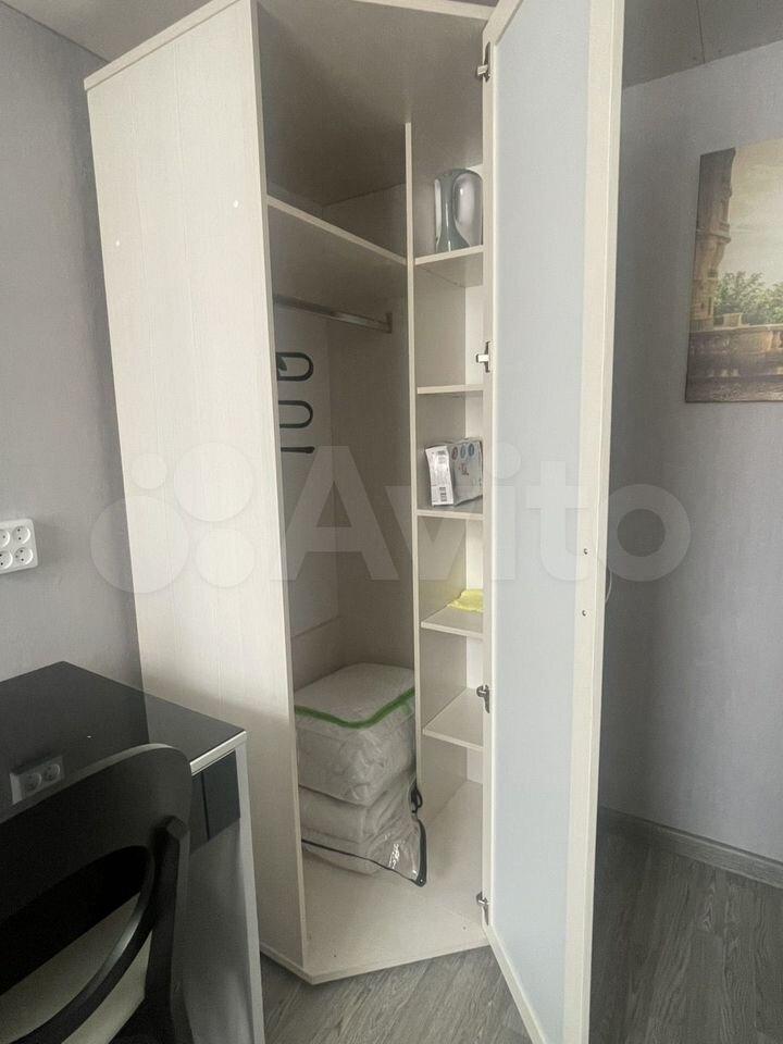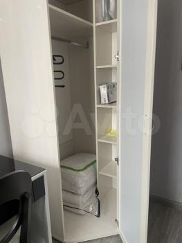 В комнате есть вся необходимая для проживания мебель, посуда и техника: двуспальная кровать, два шкафа (один в комнате, другой в общем коридоре).