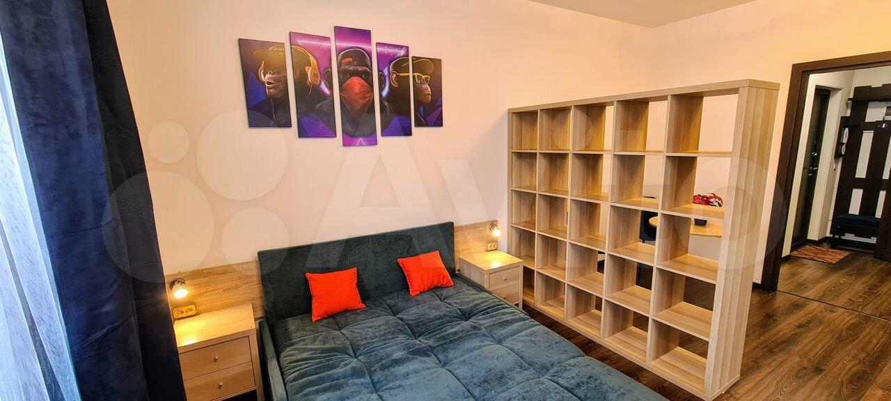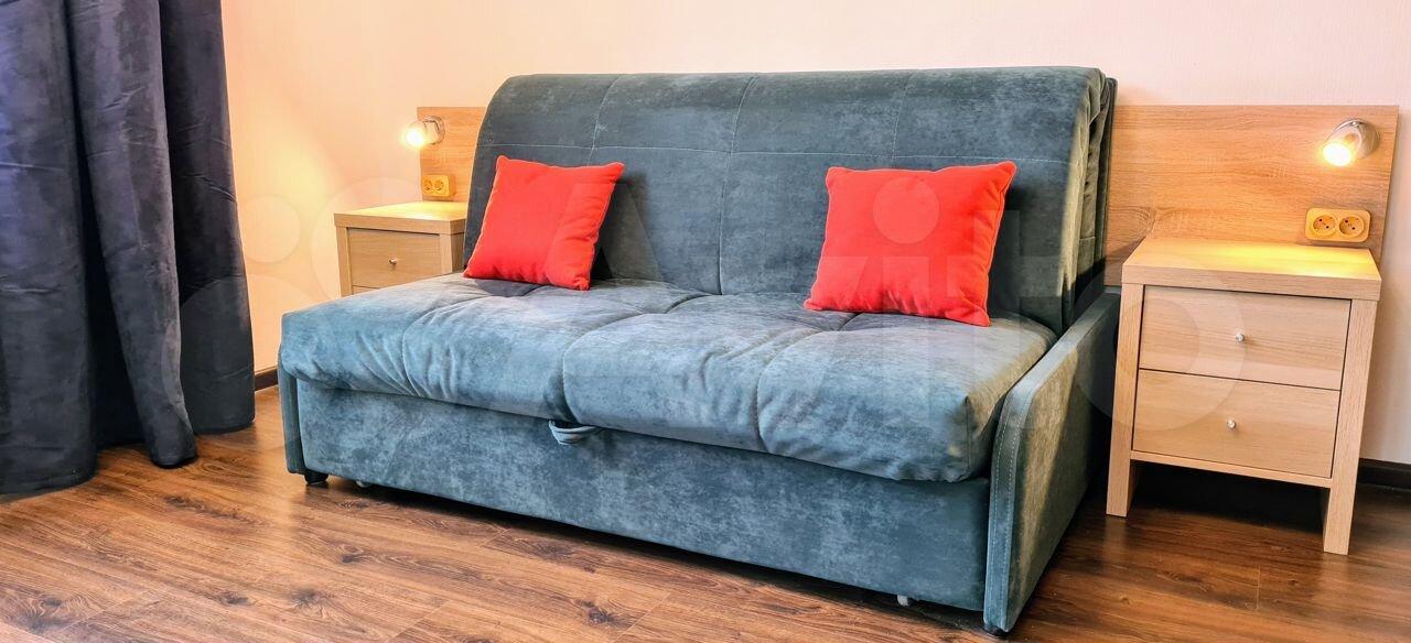? Современная мебель: евродиван- кровать: ровная поверхность для ежедневного сна, легко раскладывается, есть ящики для белья; 2 вместительных шкафа, комод 140 см с выдвижными ящиками для хранения, удобный письменный стол для дистанционной работы, стеллаж удобно разделяет кухонную зону и зону отдыха. Над комодом возможно повесить экран для проектора 150*150. Студия имеет видовые характеристики.