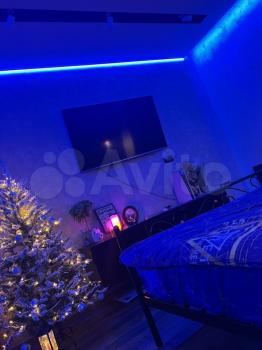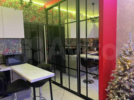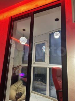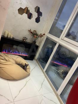 Студия с панорамными окнами за счёт чего очень светло. Много мест для хранения. Красивая многоцветная подсветка по всему периметру, камин.