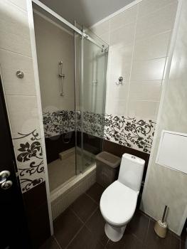 Переделанная душевая кабина, намного удобнее по сравнению с душевой от застройщика. В квартире также имеется утюг, гладильная доска, микроволновка. Комфортная лоджия со стеллажом для хранения.