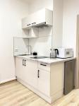В кухонной зоне установлены плита, СВЧ, электрический чайник и кофеварка, имеется набор посуды для приготовления и приема пищи.