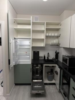 Полноценная кухня, удобная для ежедневного приготовления: варочная панель на 4 конфорки, духовой шкаф, вытяжка, посудомоечная машина, холодильник, микроволновая печь.